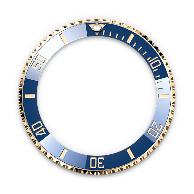 سيراكروم دوّار باتجاه واحد، ترصيعة مُدَرَّجة بـ٦٠ دقيقة من السيراميك الأزرق مقاومة للخدش، أرقام وتدريجات مطلية بالذهب