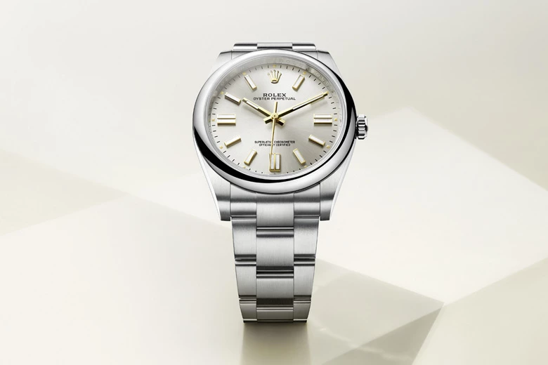 The Oyster bracelet is a perfect alchemy of form and function, aesthetics and technology. First introduced in the late 1930s, this particularly robust and comfortable metal bracelet with its broad, flat three-piece links remains the most universal bracelet in the Oyster collection. For the Oyster Perpetual models the Oyster bracelet is fitted with an Oysterclasp.